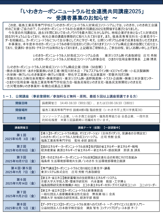 「いわきカーボンニュートラル社会連携共同講座2025」受講者募集のお知らせ